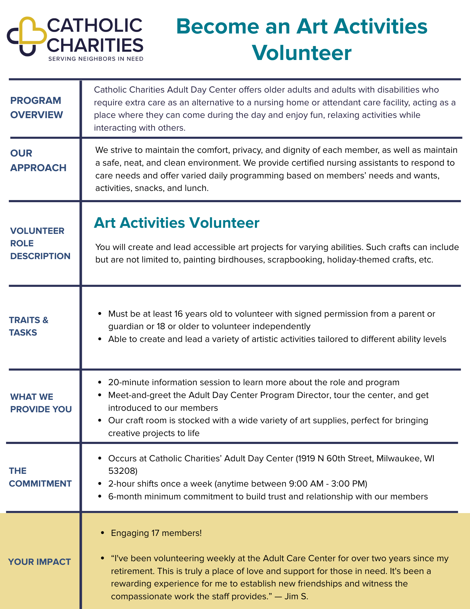 But there is another way — you can help your neighbors in need. We believe that at every age and ability, individuals deserve the support and care necessary to maintain their well-being and sense of purpose. By leading creative art activities for our members, you’re not only providing vital relief to caregivers — you’re also empowering our members to express themselves, engage their minds, and continue building meaningful connections within their community.