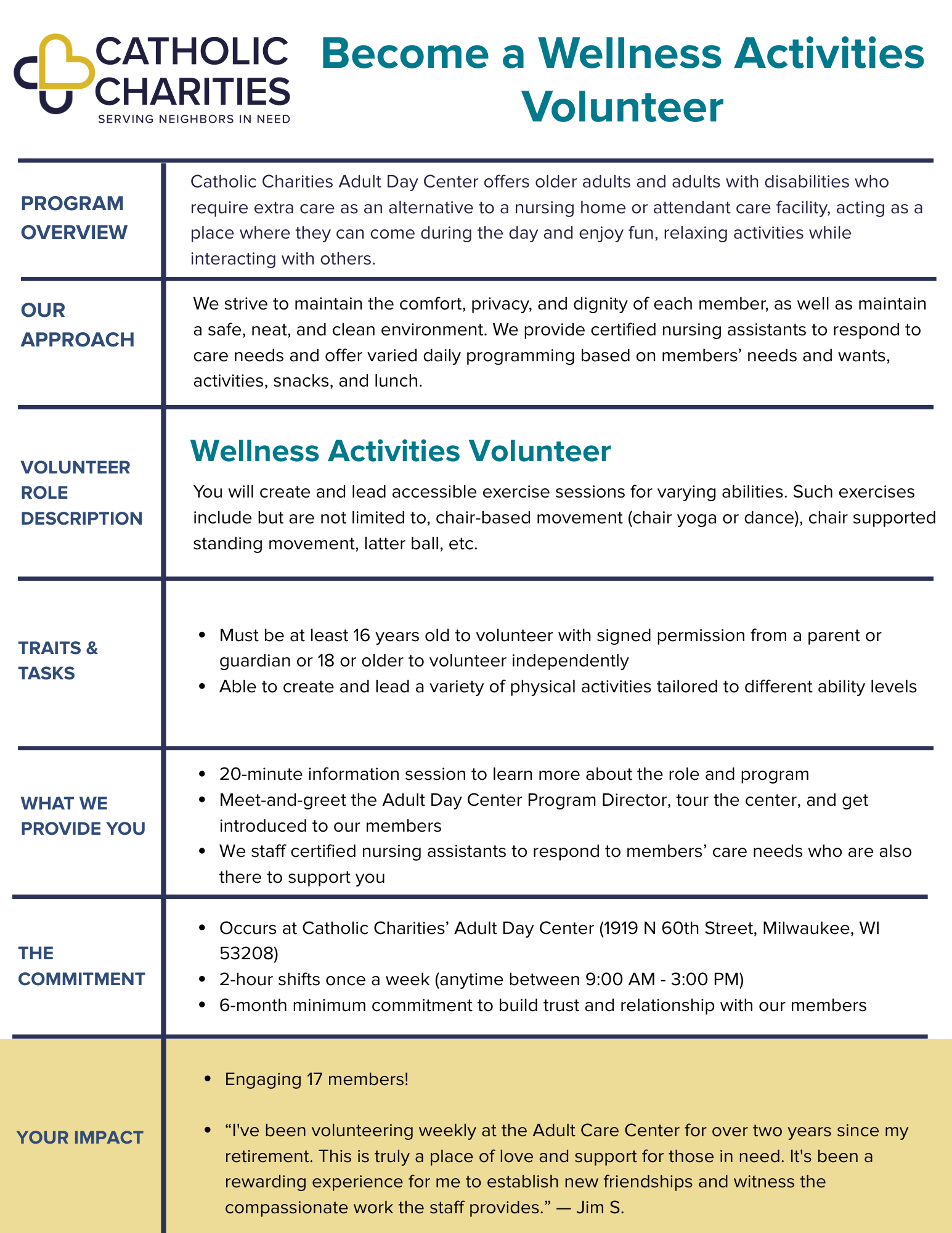 As a wellness activities volunteer, you can make a meaningful impact by helping older adults and adults with disabilities maintain their independence. By leading accessible exercise sessions, you’ll support their mobility, strength, and overall well-being. To get started, simply click RESPOND at the top of the page and SIGN UP. Within 24 business hours, we’ll email you to schedule a 20-minute virtual information session. After you complete the required forms, we’ll arrange a meet-and-greet with Annette, our Adult Day Center Program Director. You’ll have the chance to tour the center and meet our members — and then you’ll be ready to start volunteering. It’s that simple!