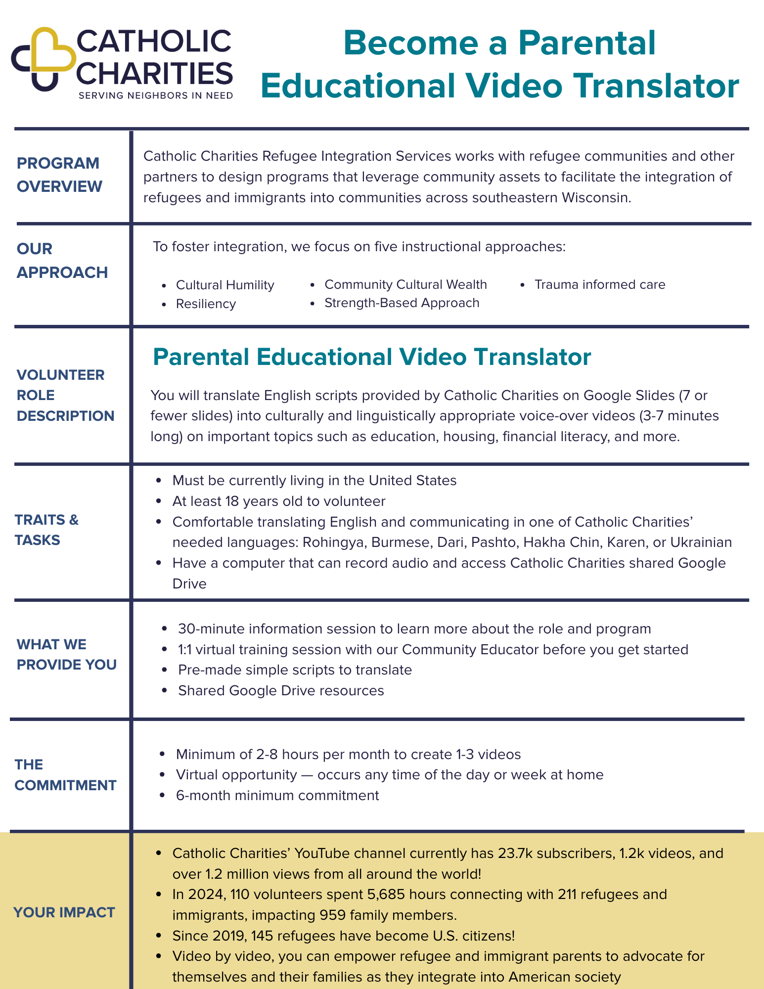 As a volunteer translator, you can make a direct impact by helping refugee and immigrant parents access vital information in a language they understand. Simply click RESPOND at the top of the page and SIGN UP, and within 24 business-day hours, we'll send you a link to our recorded information session. After completing our required forms, you'll receive personalized virtual training on how to record educational videos covering topics such as healthcare, education, and community and personal safety. Your contributions will help families feel more informed, empowered, and supported as they navigate life in a new country. It’s that simple.